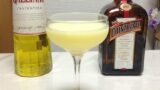 ストレーナーやバーズネストなどで濾して,塩でスノースタイル(写真はハーフムーンスタイル)にして氷1個をいれた大型カクテルグラスに注ぐ.