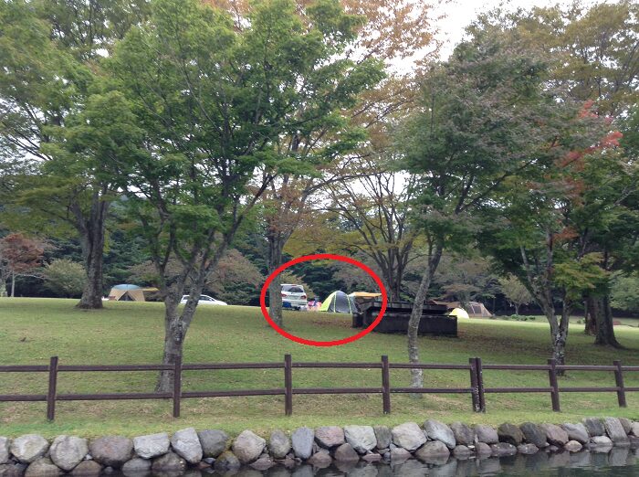 ちょっと写真ではわかりづらいですが,赤丸のところがうちのテントです.