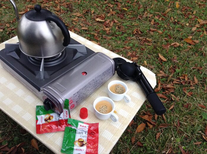 カセットコンロでお湯を沸かして,外で飲むエスプレッソも開放的でなかなか良かったです.