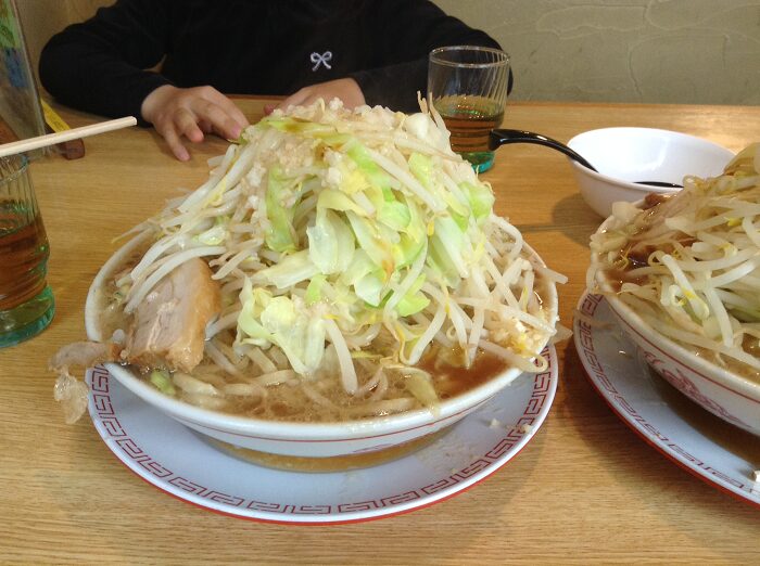私が「ラーメン・カチ盛り・野菜多め」,妻が「ラーメン・普通盛・野菜鬼盛り」,娘はそれぞれの取り分けです.